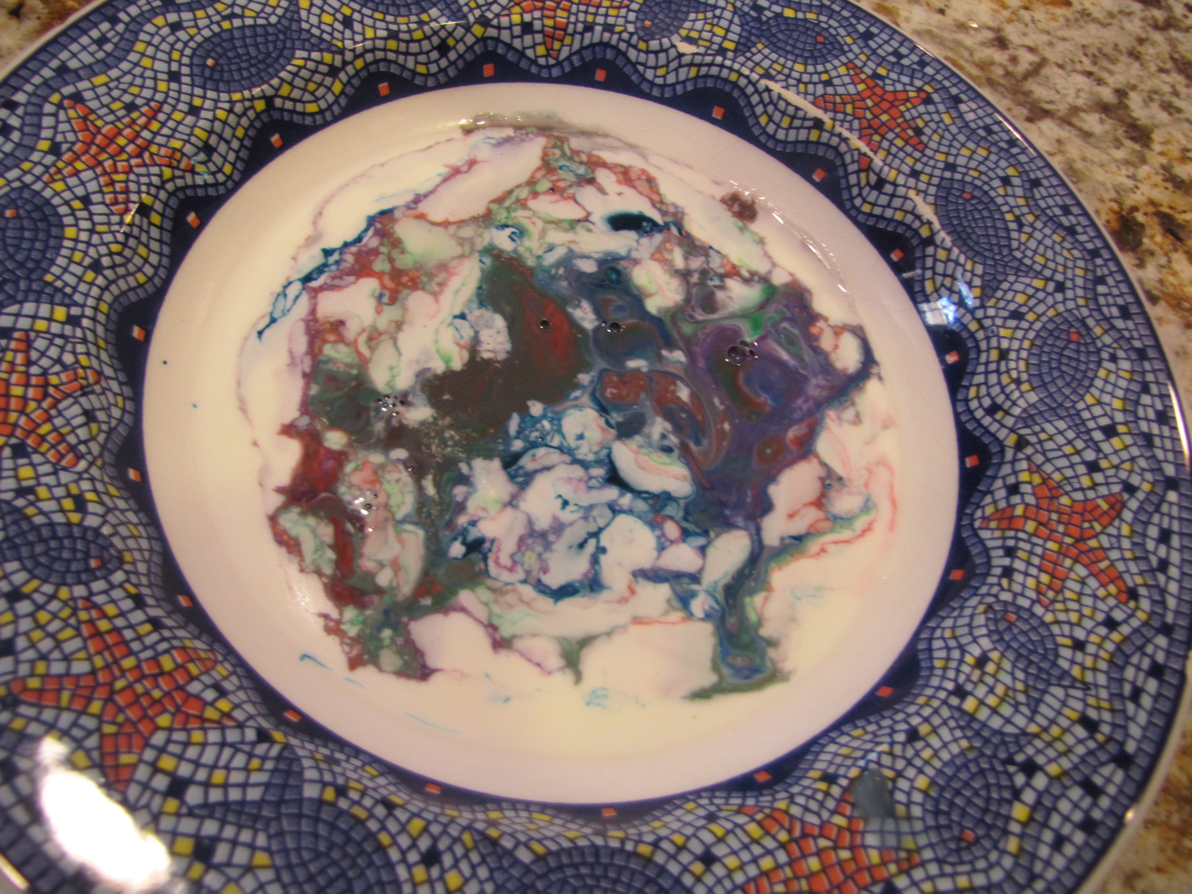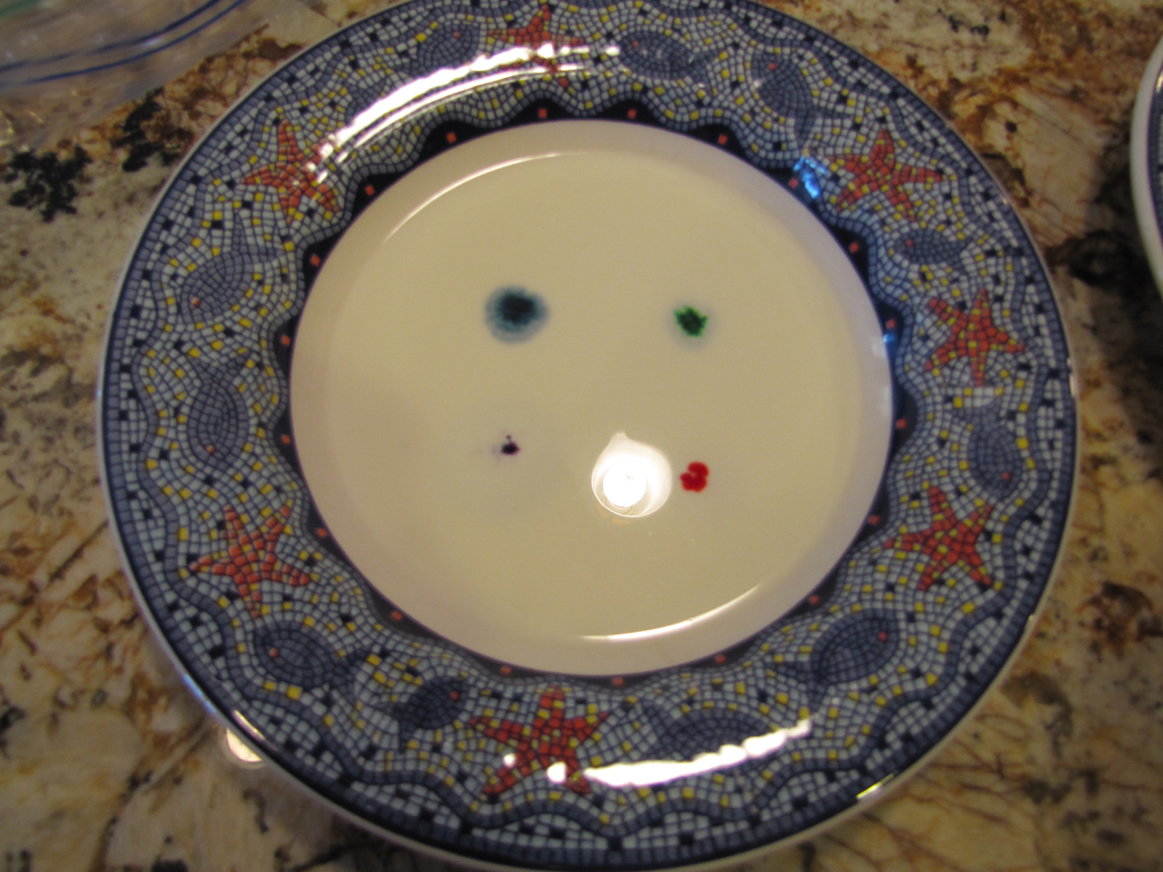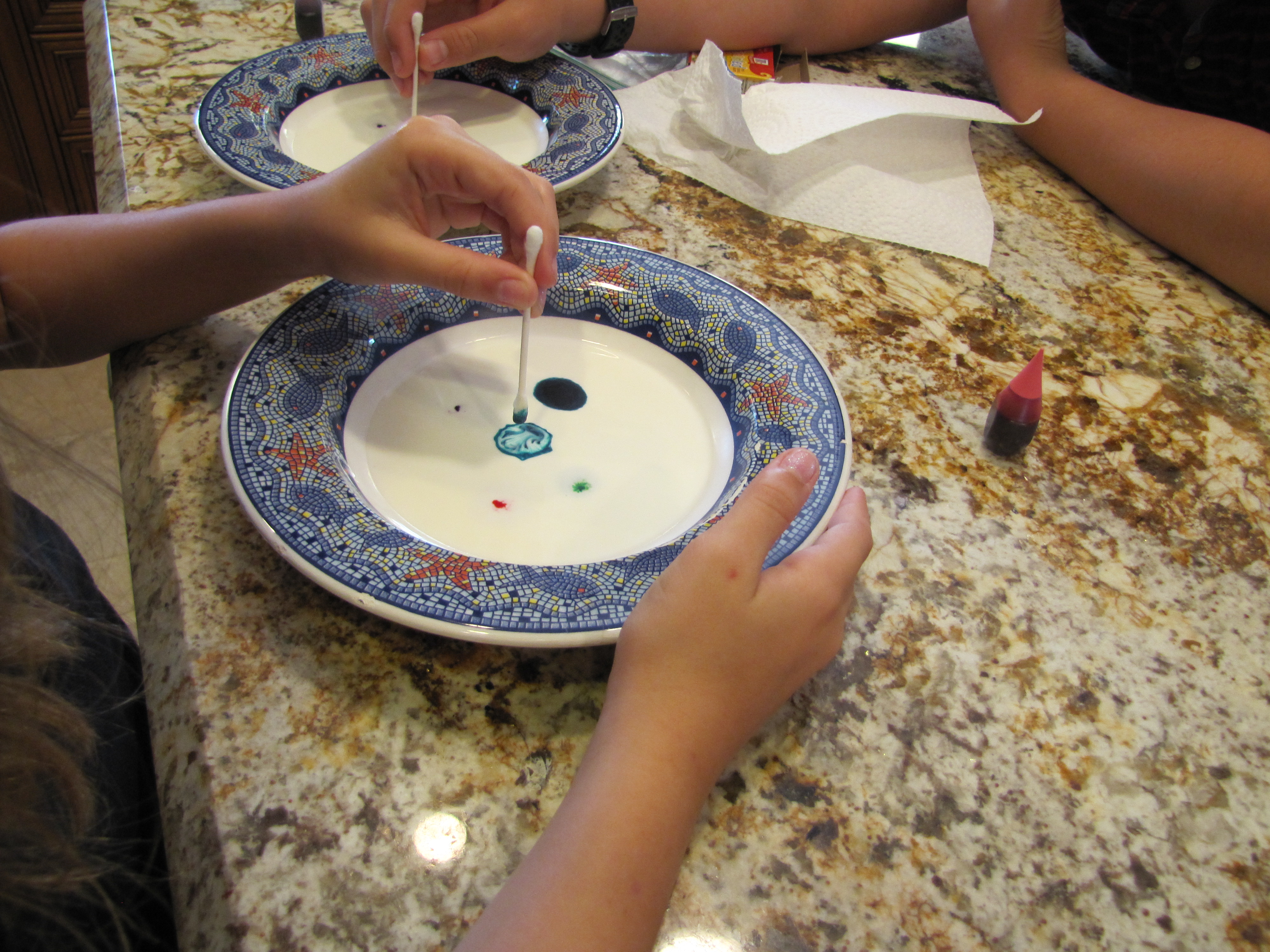 2. Dip a q-tip in dish washing detergent. Gently touch the detergent saturated q-tip to the food coloring.