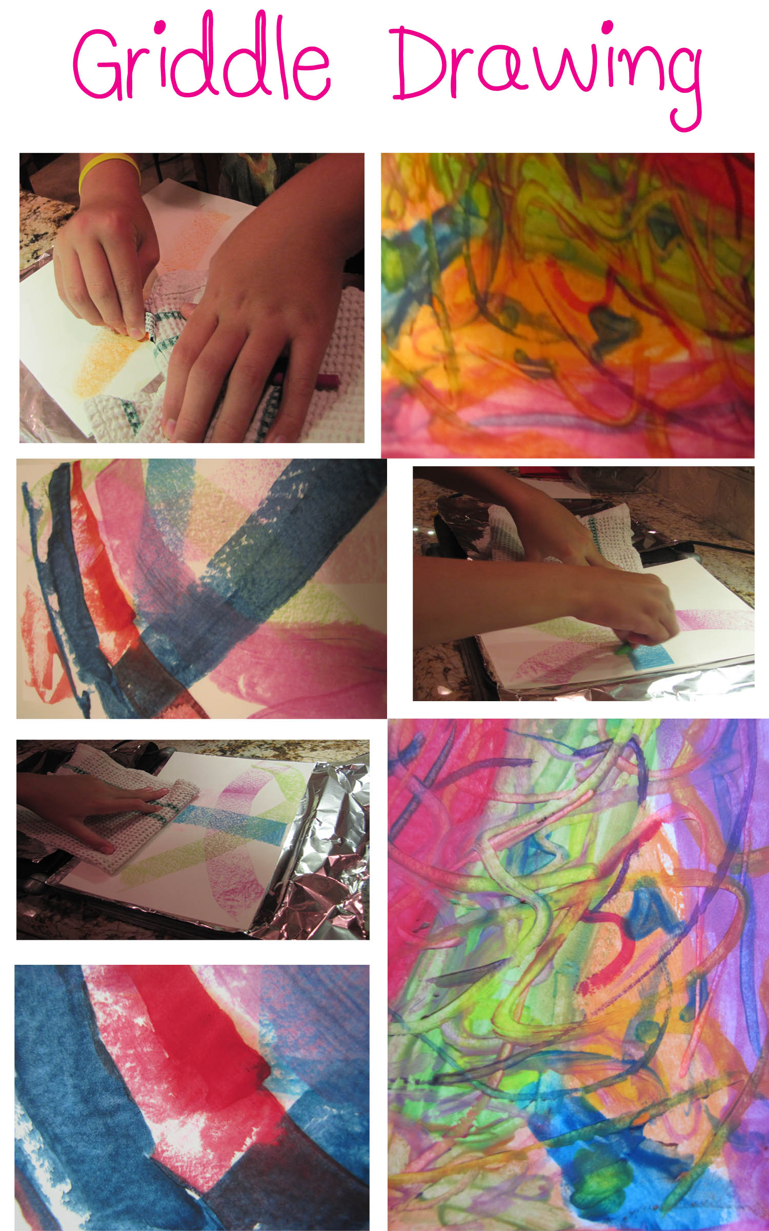 Griddle drawings are really fun and a wonderful way to use old worn-out crayons. All you need is paper, crayons, a griddle, tin foil, and a heavy duty dish towel. This activity should always be done under close adult supervision. I set my griddle to a low setting and cover the griddle with tin foil (no one likes crayon in their pancakes). We put a thick dish towel down so that the paper can be stabilized (doesn’t slide off the griddle) while drawing without burning your hand. Once your griddle is heated up you simply place your paper on your griddle and draw with crayons. The more colors you use and the more you color and layer your drawing with one color over the other the more brilliant the effect.