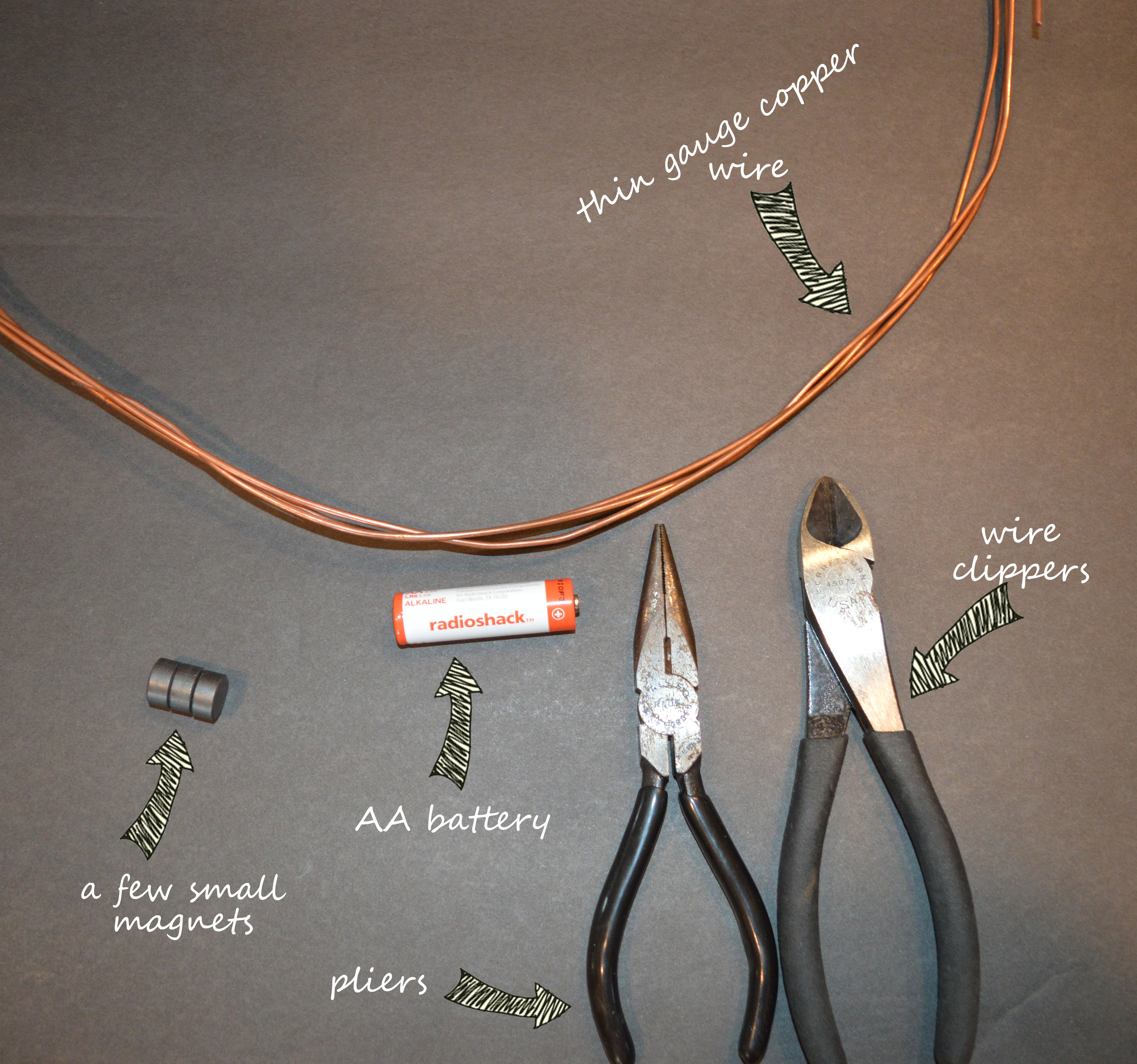 dc exp suppliesI bought the magnets and batteries at Radio Shack. The wire and tools can be purchased at Home Depot. If I was going to do this experiment all over again I would have purchased thinner wire that was more pliable. The needle nose pliers were very helpful.
